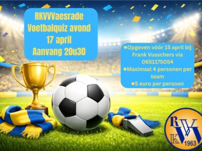 Voetbalquiz avond 17-04-2026 20:30 uur24 mrt 2026Armand achternaamBen jij een echte voetbalkenner? Of gewoon zin in een gezellige avond vol sport en plezier? Kom dan naar onze voetbalquizavond! Datum:...Read More0