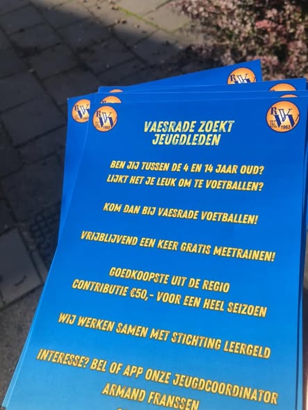 Vaesrade zoekt nieuwe jeugdleden voor de categorieรซn JO7,8 en 9!! (andere leeftijden mag natuurlijk ook)๐Ÿ’› spelplezier staat voorop ๐Ÿ’™ ieder kind is belangrijk ๐Ÿ’› lage contributie ๐Ÿ’™ veel activiteiten ๐Ÿ’› leuke leiders ๐Ÿ’™ jeugdtoernooien Kom gerust eens vrijblijvend meetrainenโ€ฆ.. Geef je dan wel even op via moniqueenarmand@ziggo.nl en wie weet sta jij of uw kind snel te shinen in je Voasje tenue ๐Ÿ’™๐Ÿ’›๐Ÿ’™๐Ÿ’› bellen mag ook naar 06-42940044 oh ja appen kan ook.. Dat is oss Voasje, Voasje allein